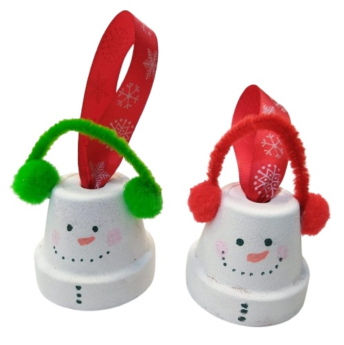 Cserepes hóember karácsonyi DIY alkotócsomag tartalma 3 db hóember készítéséhez elegendő alapanyag: 4 cm-es agyagcserép (3 db), 15 mm-es hópelyhes szatén szalag (90 cm), pompom (6 db), zseníliadrót, fehér festék.