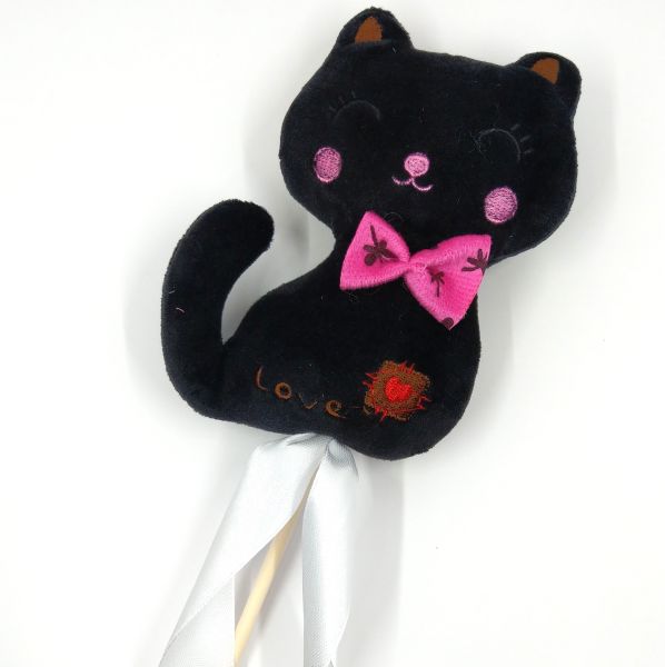 Csokorba tűzhető nagyon puha plüss cica fekete színben, fehér szalaggal, vastag pálcán. Készíts ballagási emléket, tűzd csokorba ezt a kedves figurát!