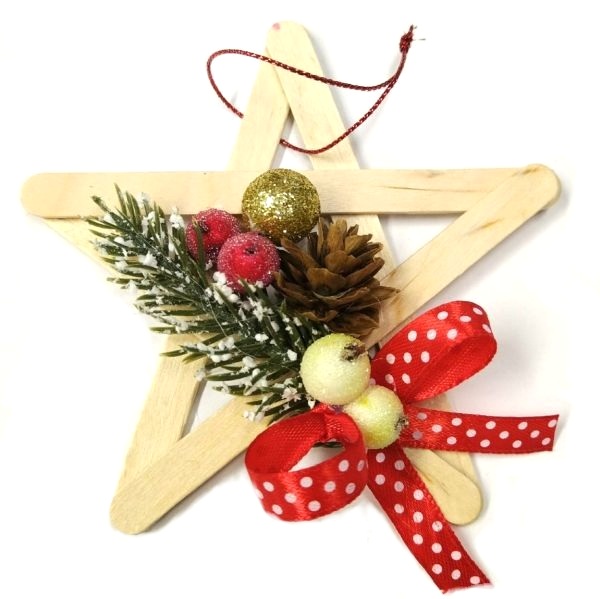 Díszes csillag spatulából karácsonyi DIY alkotócsomag tartalma 3 db csillag készítéséhez elegendő alapanyag: fa spatula (15 db), dekor elemek (műfenyő ágak, bogyók), 10 mm-es pöttyös szatén szalag (1 m), vékony díszzsinór.