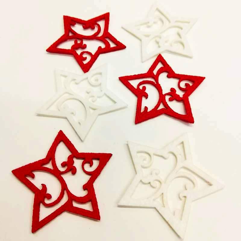 Karácsonyi díszes csillag filc figurák piros és fehér színekben, melyekkel feldobhatod koszorúidat, kopogtatóidat, asztaldíszeidet, vagy bármi más lakásdekorációdat.