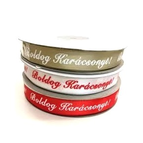 Karácsonyi szatén szalag Boldog Karácsonyt felirattal, Különböző dekorációk és virágkötészeti alkotások kiváló, sokrétűen felhasználható kelléke. Adventi kopogtatók, koszorúk, karácsonyi asztaldíszek készítéséhez tökéletes választás. További kellékeink lejjebb, a leírás részben találhatóak.