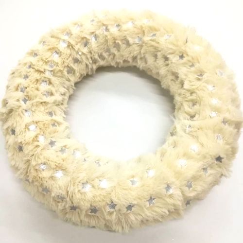 Krém szőrmével bevont koszorúalap ezüst csillagokkal, kopogtatók, asztaldíszek, koszorúk készítéséhez. Díszítsd az évszaknak megfelelően termésekkel, gyertyákkal, polifoam- és selyemvirágokkal. Használhatsz bogyókat, fafigurákat, szalagokat, kerámia figurákat vagy akár textíliát is.