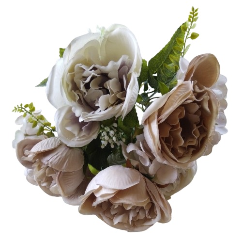 Nagyvirágú selyem bazsarózsa csokor latte színben. Élethű selyemvirág csokor tavaszi koszorúk, kopogtatók, asztaldíszek készítéséhez, vagy csak egy csokor virág az asztalra, ami soha nem hervad el.