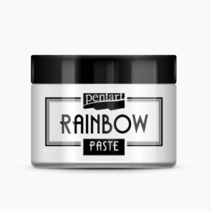 Pentart szivárvány paszta 150 ml -es kiszerelésben. Rugalmas, átlátszóra vagy opálosra száradó vízbázisú paszta, melyből kicsillannak a jeges hatást idéző holografikus pigmentek. A látvány különbözik világos illetve sötét felületen, de mindenképp lenyűgöző. Bármilyen felületre felvihető, kiválóan stencilezhető is.