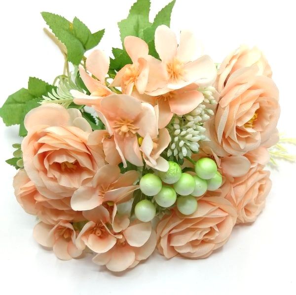 Kiszerelés: 7 szálas, különböző virágokkal: rózsa (kb. 4,5 cm), hortenzia (kb. 4,5 cm), poli bogyók kb. 12-15 mm. Csokor teljes hossza kb. 30 cm.
