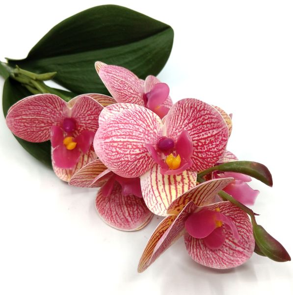 Rövidszárú élethű latex orchidea levéllel korall-sárga erezetes színben. Gyere, nézz szét nálunk, milyen alapanyag szükséges még, hogy elkészítsd álmaid rózsadobozát, asztaldíszét, kopogtatóját: